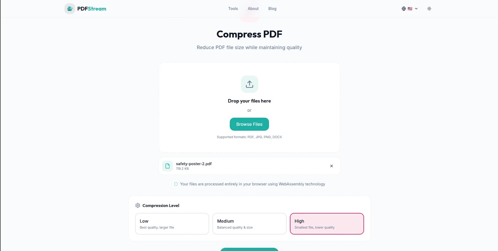 PDFStream is a free browser-based PDF toolkit that compresses PDF files entirely in your browser — with no file uploads, no account and no fees. Here is exactly how to use it: